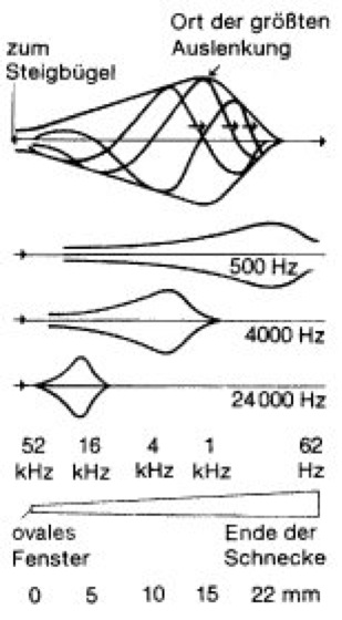 Abb. 5: Die Druckwelle (Wanderwelle) erreicht je nach Schallfrequenz ihr Schwingungsmaximum an verschiedenen Orten der Basilarmembran (Abb. oben). Abb unten: Schema der Basilarmembran mit den Regionen maximaler Schwingungsamplitude bei den eingetragenen Frequenzen.