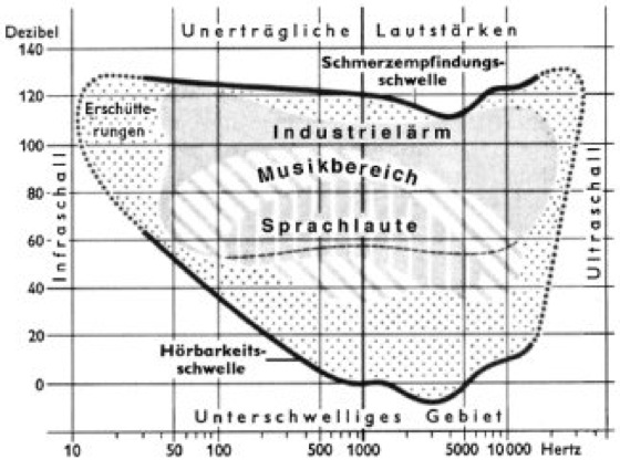 Abb. 6: Hörbereich (Hörfläche) aller hörbaren Töne des menschlichen Ohres
