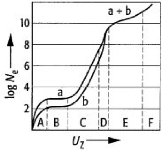 Abb. 2: Elektronenzahl Ne in Abhängigkeit von der Zählrohrspannung Uz für verschiedene Werte (a, b) der Primärionisation. A Bereich der Ladungssammlung, B Ionisationskammerbereich, C Proportionalbereich, D Geiger-Schwelle, E Auslösebereich, F Dauerentladung.