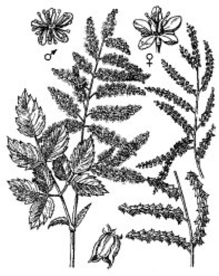 Abb. 1: Wald-Geißbart (Aruncus dioicus): links männlicher Blütenzweig und Einzelblüte, rechts oben weiblicher Blütenzweig und Einzelblüte, rechts unten Zweig mit Früchten und Einzelfrucht.