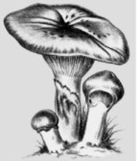 Gelbfüße, Gomphidiaceae R. Mre., Familie der Blätterpilze(Agaricales), früher der Boletales (Röhrenpilze); Hutpilze mit fleischigem Fruchtkörper, dessen lamelliges Hymenophor weit am Stiel herabläuft. Die Lamellen sind dicklich, entfernt stehend, trocken oder schleimig und besitzen eine bilaterale Trama. Das Sporenpulver ist fast schwarz oder olivschwärzlich; die Sporen sind fast spindelig. Gelbfüße sind Mykorrhizapilze bestimmter Nadelbäume. Bekanntester Vertreter ist der eßbare Gomphidius glutinosus Schaeff. (Großer Schmierling, Kuhmaul, Großer Gelbfuß; üß vgl. Abb. ); sein Hut (5–10 cm Durchmesser) ist mit dicker Schleimhaut überzogen, die beim jungen Pilz auch die Lamellen einschließt; auch der Stiel ist schleimig, weißlich, an der Basis zitronengelb, mit schleimigem, durch Sporen dunkel gefärbtem Schleimring; er kommt häufig in Nadelwäldern, vor allem in jungen Fichtenbeständen, vor (Juli–Oktober). Weitere Gattungen sind Brauniellula und Chroogomphus.
