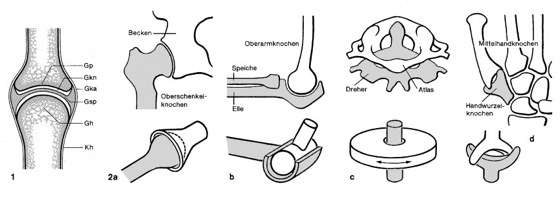 1 Aufbau eines Kugelgelenks. 2 Die verschiedenartigen Gelenke des menschlichen Skeletts; aKugelgelenk (Hüftgelenk), bScharniergelenk (Ellenbogengelenk), cDrehgelenk (Halswirbelgelenk), dSattelgelenk (Daumengelenk).