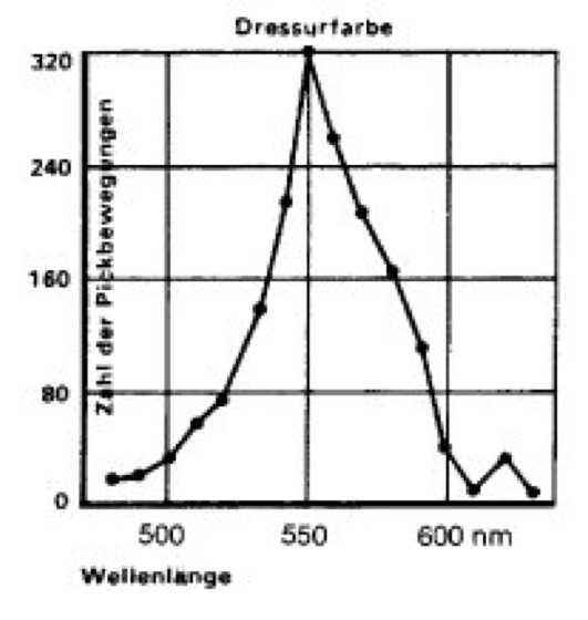 Eine Taube hatte gelernt, gegen eine gelbgrüne Scheibe zu picken, um Futter zu erhalten. Die Dressurfarbe, d.h. die Farbe der Scheibe, hatte eine Wellenlänge von 550 nm. Dann wurde die Belohnung eingestellt und die Scheibe in zufälliger Reihenfolge auch mit anderen Farben beleuchtet. Jede dieser Farben wurde im ganzen gleich lange geboten, und bei jeder wurden die Pickbewegungen der Taube gegen die Scheibe registriert. Die Generalisierung besteht darin, daß das Versuchstier nicht nur auf die Dressurfarbe, sondern auch auf andere, ähnliche Farben in einem nach der Ähnlichkeit abgestuften Maß anspricht.