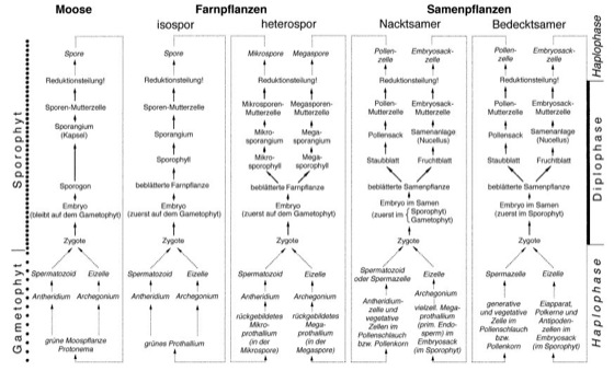Vergleichende Darstellung des Generations- und Kernphasenwechsels bei den Moosen, iso- und heterosporen Farnpflanzen sowie nackt- und bedecktsamigen Samenpflanzen. In der Abb. stehen homologe Entwicklungsphasen, Fortpflanzungszellen und -organe jeweils auf gleicher Höhe.