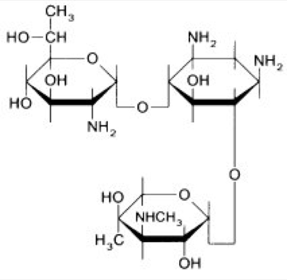 Geneticins, G418, ein mit Gentamicin verwandtes, jedoch stärker antibiotisch wirksames Aminoglykosid (Aminoglykosid-Antibiotika). G418 ( vgl. Abb. ) kann bei verschiedenen molekularbiologischen Experimenten als selektierendes Agens eingesetzt werden (s.u.). Resistenzen gegen G418 sind dominant; die dafür verantwortlichen Gene wurden ursprünglich innerhalb verschiedener bakterieller Transposonen gefunden und aus diesen isoliert. Sie codieren jeweils für Aminoglykosid-Phosphotransferasen (APT), welche G418 an bestimmten Hydroxylgruppen phosphorylieren und dessen Wirkung unterdrücken. Die Besonderheit des G418/APT-Systems ist, daß das Antibiotikum auch für ein breites Spektrum eukaryotischer Zellen toxisch ist und die Resistenz vermittelnden prokaryotischen Gene ebenfalls in diesen Zellen exprimiert werden können. G418-Resistenz kann somit als dominanter Selektionsmarker bei molekularbiologischen Arbeiten mit höheren Zellen analog den Arbeiten mit Bakterien benutzt werden. Antibiotika, G418-Selektion.