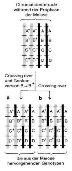 Genkonversionw [von latein. conversio = Umkehrung], die Umwandlung eines Allels in ein anderes während der Rekombination zwischen 2 DNA-Molekülen (Desoxyribonucleinsäuren), auf denen die beiden allelen Formen des betreffenden Gens liegen. Genkonversion führt dazu, daß die beiden Allele in den Produkten des Rekombinationsereignisses ungleich (nicht 2:2, sondern z.B. 3:1 oder 1:3) verteilt sind ( vgl. Abb. 1 ). Aus diesem Grund läßt sich Genkonversion bei Eukaryoten am besten dann beobachten, wenn die Produkte einer Meiose, während der das Crossing over stattfindet, direkt faßbar sind, wie z.B. bei den Ascosporen von Neurospora crassa (Neurospora). Besonders häufig wird Genkonversion bei Allelen gefunden, die in direkter Nachbarschaft des Austauschpunkts (Ort von „Brechen und Wiedervereinigen“) während des Crossing over auf den beiden beteiligten DNA-Molekülen lokalisiert sind. Die Häufigkeit der Genkonversion nimmt mit der Entfernung von den Bruchpunkten ab. Ursache der Genkonversion sind Reparaturprozesse (DNA-Reparatur) an fehlgepaarten DNA-Abschnitten (Heteroduplices, engl. mismatches), die während der einleitenden Phase des Crossing over entstehen, wenn sich nicht vollständig komplementäre DNA-Einzelstränge von homologen, aber nicht identischen Genen (Allelen) paaren ( vgl. Abb. 2 ). Sofern z.B. in Reparatur-defekten Mutantenstämmen die Heteroduplex-Bereiche (Heteroduplex) nicht repariert werden, trennen sich die allelen DNA-Stränge bei der nächsten Replikation und führen dann ohne Genkonversion in der Folgegeneration zu einer 1:1-Aufspaltung der beiden Allele. Besonders in bakteriellen Systemen führt die Genkonversion auch zu anderen Aufspaltungsverhältnissen der Nachkommen-Allele als zu den durch die Tetradenbildung bedingten 1:3- bzw. 3:1-Verhältnissen.