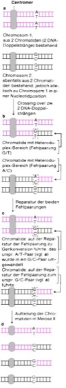 c Die Reparatur der Fehlpaarungen führt dazu, daß in beiden Fällen die hier farbig wiedergegebenen Anteile ersetzt werden und damit ein ursprüngliches A/T-Paar in ein G/C-Paar umgewandelt wird. Grundsätzlich möglich wäre auch die Umwandlung eines G/C-Paares in ein A/T-Paar oder die gleichzeitige Umwandlung eines A/T-Paares in ein G/C-Paar und eines G/C-Paares in ein A/T-Paar. Im letztgenannten Fall könnte die Genkonversion nicht am Verteilungsverhältnis der Allele in den Meiose-Produkten erkannt werden.