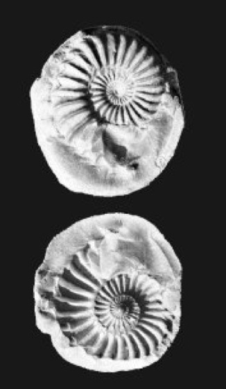 Pleuroceras (Ammonit) aus dem Unter-Jura, als Körperfossil eingeschlossen in einer Konkretion (aufgeschlagene Geode), Schalenerhaltung zeigend