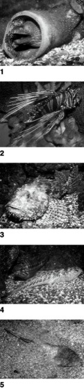 1 Mittelmeermuräne (Muraena helena),2 Rotfeuerfisch (Pterois spec.),3 Drachenkopf (Scorpaena spec.),4 Petermännchen (Trachinus draco),5 Gemeiner Himmelsgucker (Uranoscopus scaber)