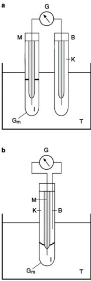 schematischer Aufbau. a pH-Meter mit getrennter Meß- und Bezugselektrode, b Kombinationselektrode. B Bezugselektrode, G Galvanometer, Gm H+-selektive Glasmembran, I Innenpuffer, K 3,5 M KCl-Lösung, M Meßelektrode, T Testlösung