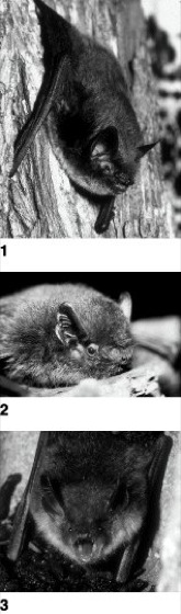 Abb. 1: 1 Wasserfledermaus (Myotis daubentoni),2 Zwergfledermaus (Pipistrellus pipistrellus),3 Fransenfledermaus (Myotis nattereri)