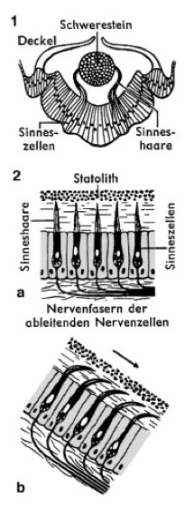Statocyste einer Rippenqualle; 2 Schnitt durch ein Gleichgewichtsorgan der Säugetiere, a in Normal-, b in Schieflage