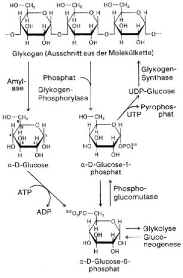 Glykogens [von *glyko- , griech. gennan = erzeugen], Glycogen, Leberstärke, süßlich schmeckendes Polysaccharid, das aus 5000–100.000 1,4-glykosidisch verknüpften α-D-Glucoseeinheiten (Glucose) mit zusätzlichen 1,6-glykosidischen Verzweigungen (etwa an jeder 10. Glucose-Einheit) aufgebaut ist ( vgl. Abb. 1 ). Glykogen kommt als Energiereservesubstanz (Reservestoffe) generell im Tierreich und bei Pilzen vor, bei Wirbeltieren besonders in der Leber (bis zu 10% des Feuchtgewichts), aber auch im Muskel-Fleisch und Ei-Dotter. Es ist (neben freier Glucose) Ausgangsprodukt der Glykolyse (Farbtafel). – Beim Glykogenabbau (Glykogenolyse) wird es in einem ersten, durch das Enzym Glykogen-Phosphorylase katalysierten Schritt phosphorolytisch zu Glucose-1-phosphat abgebaut oder durch Amylasen hydrolytisch zu Glucose und Maltose gespalten ( vgl. Abb. 2 ). Die Glykogen-Phosphorylase überträgt den Glucoserest vom nichtreduzierenden Ende des Glykogens auf anorganisches Phosphat unter Bildung von Glucose-1-phosphat, das zu Glucose-6-phosphat isomerisiert und dann in den allgemeinen Kohlenhydratabbau (Kohlenhydratstoffwechsel) einfließt. An den Verzweigungspunkten kann es nur durch Hydrolyse gespalten werden, weshalb auch beim phosphorolytischen Abbau neben Glucose-1-phosphat immer ein gewisser Anteil (ca. 10%) an freier Glucose entsteht. Ausgangsverbindung für die Glykogensynthese ist Glucose-6-phosphat, das durch eine Phosphoglucomutase in Glucose-1-phosphat umgewandelt wird. Glucose-1-phosphat kann auch direkt über den Weg der Gluconeogenese bereitgestellt werden. Wichtiges katalytisch wirkendes Cosubstrat ist dabei Glucose-1,6-bisphosphat. Die Glykogensynthese verläuft über ein aktiviertes Zuckerderivat, die Uridindiphosphat-Glucose (UDP-Glucose). Hierbei wird enzymatisch das C-Atom 1 der Glucoseeinheit an das C-Atom 4 des endständigen Glucoserestes eines vorgegebenen Startpolysaccharids angeheftet. Dieser Prozeß wird durch die Glykogen-Synthase katalysiert und wiederholt sich in vielen Schritten bis zur Ausbildung der für das Lebercytosol charakteristischen Glykogengranula ( vgl. Abb. 3 ) von 20–200 nm Durchmesser. Letztere bestehen vorwiegend aus Glykogen, enthalten jedoch in locker gebundener Form auch die Enzyme des Glykogenaufbaus und -abbaus. Die Verzweigungen der Glykogenstruktur kommen dadurch zustande, daß das Enzym Amylo-1,4 →1,6-Transglucosidase (sog. Verzweigungsenzym oder Q-Enzym: branching enzyme) die jeweils zuletzt aneinandergeknüpften 6–7 Glucosereste als Oligosaccharid auf die 6-OH-Gruppe eines Glucoserestes derselben oder einer anderen Glykogenkette überträgt. – Auf- und Abbau von Glykogen sind sowohl nervös über Calcium und Calmodulin als auch hormonell durch Adrenalin, Glucagon und Insulin reguliert. Die Glykogen-Synthase kommt in den Muskeln gewöhnlich in aktiver Form (a) vor, während die Glykogen-Phosphorylase in ihrer inaktiven Form (b) vorliegt. Adrenalin (im Muskel) und Glucagon (in der Leber) führen nach Bindung an die Rezeptoren über heterotrimere G-Proteine zur Aktivierung der Adenylat-Cyclase ( vgl. Abb. 4 ). Das dabei gebildete cAMP aktiviert eine Reihe von Proteinkinasen, u.a. auch die Proteinkinase A (cAMP-abhängige Proteinkinase, PKA), welche die Phosphorylase-Kinase aktiviert. Die Proteinkinase A katalysiert die Phosphorylierung von Glykogen-Synthase, die damit in die weniger aktive b-Form überführt wird, Phosphorylase-Kinase die Phosphorylierung von Glykogen-Phosphorylase, die damit aktiv wird (a-Form). Die Phosphorylierung mobilisiert also den Abbauweg des als Energiereserve gespeicherten Glykogens (Blutzucker). Die von Insulin ausgelöste Signalkaskade führt, vermittelt durch Phosphoprotein-Phosphatase, zur Dephosphorylierung von Glykogen-Synthase und Glykogen-Phosphorylase und damit zur Induktion des Aufbauweges von Glykogen. Ein weiterer Regulationsmechanismus ist die Ca2+/Calmodulin-Abhängigkeit der Phosphorylase-Kinase-Aktivität, was eine Integration der stimulierenden Hormoneffekte und Nervenimpulse (dadurch ausgelöste Ca2+-Freisetzung löst Muskelkontraktion aus) vermittelt. Von wesentlicher Bedeutung sind außerdem allosterische Mechanismen (Allosterie). Die phosphorylierte, weniger aktive Glykogen-Synthase b kann z.B. durch einen hohen Glucose-6-phosphat-Spiegel aktiviert werden. Die inaktive Phosphorylase b kann durch AMP (Adenosinmonophosphat), das aufgrund von Muskelaktivität explosionsartig auftritt, allosterisch aktiviert bzw. der aktivierenden Phosphorylierung zugänglich gemacht werden. ATP und Glucose-6-phosphat wirken entgegengesetzt auf die aktive Phosphorylase a. Die Energiereserve des Glykogens kann mit Hilfe dieser Regulationsmechanismen, im Gegensatz zu der als Langzeitspeicher fungierenden Energiereserve der Fette und Fettgewebe, sehr schnell für den Körper nutzbar gemacht werden. Bernard (C.), Cori (C.F.), Embden (G.), endoplasmatisches Reticulum, Glykogenin, Glykogenose, Hensen (C.A.V.), Homoglykane, Kampf-oder-Flucht-Reaktion, Leloir (L.F.), Meyerhof (O.F.), Sutherland (E.W.), Winterschlaf; Hormone, Stoffwechsel.