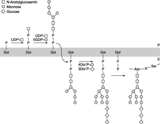 N-Glykosylierung: Die Synthese des zentralen Oligosaccharids wird auf der P-Seite des endoplasmatischen Reticulums durch die Übertragung von N-Acetylglucosamin auf Dolicholphosphat (Dol-P) initiiert. Die Anknüpfung eines weiteren N-Acetylglucosamins (GlcNAc) sowie von 9 Mannose- (Man) und 3 Glucoseeinheiten (Glc) erfolgt in einem geordneten Prozeß mittels spezifischer Transferasen. Auf der Stufe des Dol-P-P-GlcNAc2-Man5 kommt es in einem nicht näher charakterisierten Vorgang zur Translokation des Oligosaccharids auf die E-Seite. Das Endprodukt Dol-P-P-GlcNAc2-Man9-Glc3 wird unter Freisetzung von Dolicholpyrophosphat auf einen spezifischen Asparagin-Rest eines Polypeptidakzeptors übertragen. Die weitere Prozessierung beginnt mit der Entfernung der 3 Glucosereste, die Abspaltung von Mannose-Resten geht mit dem Transfer in den Golgi-Apparat einher. Dort erfolgen in Abhängigkeit vom Zielort der Glykoproteine weitere Modifikationen wie die Abspaltung weiterer Mannose-Reste sowie das Anknüpfen von Fucose-, Galactose- und Sialinsäureeinheiten.