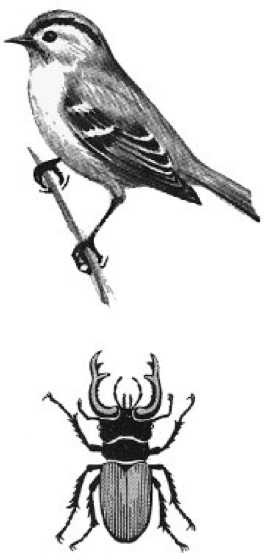 Größenvergleich (maßstäblich) des kleinsten deutschen Vogels (Wintergoldhähnchen, Regulus regulus) unddes größten deutschen Käfers (Hirschkäfer, Lucanus cervus)