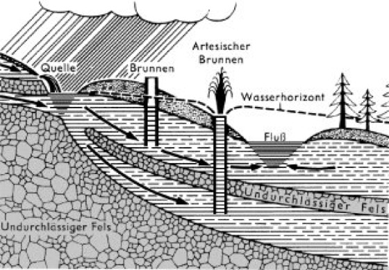 Grundwasser, dauernd vorhandene, die Gesteinshohlräume und Bodenporen (Bodenwasser, Porung) füllende Wasseranreicherung ( vgl. Abb. ). Grundwasser entsteht durch die Versickerung von Niederschlag und Oberflächenwasser. Der Grundwasserspiegel schwankt jahreszeitlich und hängt örtlich von der Niederschlagsmenge, der Durchlässigkeit der tieferen Bodenbereiche und der Oberflächenneigung ab. Nur vorübergehend über oberflächennahen undurchlässigen Schichten angesammeltes Wasser wird als Stauwasser bezeichnet. Innerhalb einer Landschaft pegelt sich der Grundwasserspiegel nach den hydrostatischen Druckverhältnissen ein. Höherliegendes Grundwasser fließt als Grundwasserstrom lateral im Boden talwärts oder es gelangt als Quellwasser an die Bodenoberfläche. Ist der hydrostatische Druck im Bodeninnern höher als an der Bodenoberfläche, so entsteht ein Artesischer Brunnen. Eingriffe des Menschen, wie Überbauung, Kanalisation, Vertiefung und Begradigung von Gewässern (Fließgewässer) und reichliche Grundwasserentnahme für Trink- und Brauchwasser haben zur Absenkung des Grundwassers mit bedenklichen Auswirkungen auf Vegetation und Klima geführt. Durch den Eintrag von Stickstoffverbindungen (Stickstoff, Stickstoffauswaschung), Chloriden (Chlor) und Schwermetallen aus landwirtschaftlicher Düngung (z.B. mit Gülle) sowie den Einsatz von Pestiziden (Wasserverschmutzung) wird die Trinkwasseraufbereitung (Kläranlage, Wasseraufbereitung) aus Grundwasser (70% der öffentlichen Wasserversorgung) immer aufwendiger und kostenintensiver. Abwasser, alternativer Landbau, Altwasser, Bioremediation, Bodenentwicklung, Feuchtgebiete, Landwirtschaft, Stygobionten, Wasserkreislauf (Abb.).