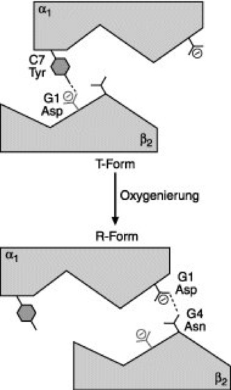 Abb. 2: Bei der Oxygenierung geht das Hämoglobin bzw. der Kontaktbereich von α1- und β2-Untereinheit von der T- (tense) in die R-Form (relaxed) über. Die Untereinheiten können aufgrund der sog. Schwalbenschwanzgestalt leicht beide Formen einnehmen.