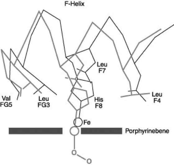 Abb. 3: Im desoxygenierten Zustand liegt das Häm-Eisenatom etwas außerhalb der Ebene des Porphyrinrings. Bei der Oxygenierung bewegt sich das Eisenatom in die Häm-Ebene hinein, wobei die Position des proximalen Histidinrestes (F8) und damit der ganzen F-Helix sowie der angrenzenden nichthelikalen Segmente (EF- und FG-Ecke) verschoben wird.