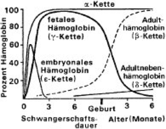 Abb. 4: Bildung der Polypeptidketten der verschiedenen Hämoglobine während der Individualentwicklung des Menschen. Die α-Ketten sind in allen Hämoglobinen enthalten.