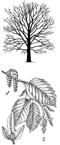 Oben Wuchsform, unten Zweig der Hainbuche (Carpinus betulus) mit staminaten (♂) und karpellaten (♀) Blütenständen; links flügelartig verwachsene Vorblätter mit Frucht.