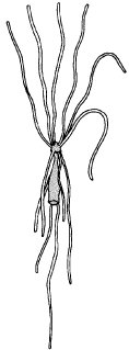 Halammohydraw [von *hal- , griech. ammos = Sand, hydra = Wasserschlange], Gattung der Narcomedusae, die das Mesopsammon bewohnt. Halammohydra octopodoides ist eine 1,3 mm lange polypenförmige Meduse ( vgl. Abb. ) mit schlankem Körper und 2 Tentakelkränzen, unter denen Statocysten (Gleichgewichtsorgane) liegen; gesamte Oberfläche bewimpert; schwimmt mit Hilfe der Bewimperung über und zwischen den Sandkörnern. Aboral befindet sich eine Saugscheibe zum Festsetzen. Eizellen und Samenzellen reifen im Ektoderm; Entwicklung über eine Actinula. Die Art kommt auch an europäischen Küsten in mittelfeinen Sanden vor. Systematische Stellung umstritten (wird auch als eine eigene Gruppe Halammohydrina angesehen oderzu den Hydroidea gestellt).