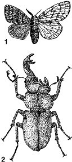 Halbseitenzwitter bei Insekten (links ♂, rechts ♀): 1 Schwammspinner (Lymantria dispar),2 Hirschkäfer (Lucanus cervus)