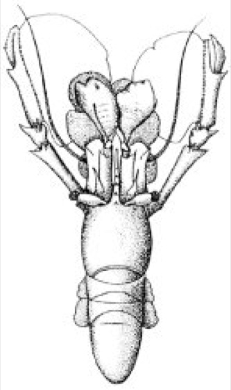 Harlekingarnelew [von *Harlekin ],Hymenocera picta (Familie Gnathophyllidae), sehr merkwürdige Garnele (Natantia), deren 1. Antennen und Scheren des 2. Laufbeinpaares zu flachen Lamellen abgeplattet sind ( vgl. Abb. ); außerdem auffällig leuchtend rotbraun und weiß gefärbt. Sie lebt paarweise auf Korallen, vor allem am Großen Barriereriff, und ernährt sich von dem sehr viel größeren Dornenkronen-Seestern, den sie hochstemmen und umdrehen muß, um an die weiche Unterseite zu gelangen. Dauernde Paarbindung; die Tiere erkennen ihren Partner wahrscheinlich am Geruch.