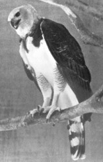 Harpyiew, Harpia harpyja, mächtiger, bis 1 m langer Greifvogel (Familie Habichtartige), den Adlern nahestehend, der in tropischen Wäldern von Paraguay bis Mexiko lebt und dort vor allem Affen, Nasenbären und Faultiere schlägt; trotz der Größe wendiger Flieger, gilt als einer der kräftigsten Greifvögel ( vgl. Abb. ); nistet auf hohen Bäumen; 2 Eier. Indianer nehmen Junge aus dem Horst und halten sie in Gefangenschaft, um die als Tauschobjekt begehrten Federn zu bekommen. ö Greifvögel II , Südamerika III.