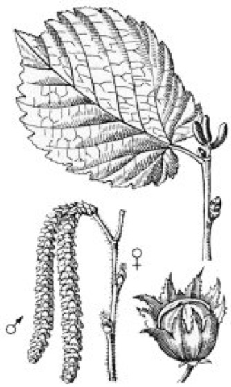 Zweig des Haselstrauchs (Corylus avellana) mit Blütenknospen; links Zweig mit staminaten (♂) und karpellaten (♀) Blütenständen, rechts Frucht