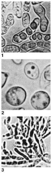 Mikroskopische Aufnahmen von Hefen. 1 Hefe kopulierend und Ascosporen bildend; 2 zitronenförmige Apiculatus-Hefe (Spitz-Hefe) in Sporenbildung; 3 Kahmhefe im Sproßverband