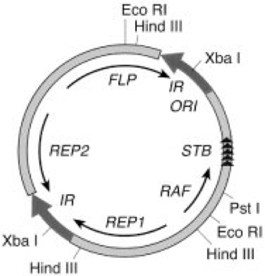 Das 2 μm-Plasmid enthält 4 proteincodierende Regionen (REP1, REP2, FLP sowie RAF[REP3]), 1 Stabilitätslocus (STB) mit 5 kurzen Sequenzduplikationen, den Replikationsstartpunkt für die bidirektionale Replikation (ORI) sowie 2 IR-Segmente mit Sequenzen für die FLP-Rekombinase. Gekennzeichnet sind ferner für genetische Arbeiten wichtige Schnittstellen für Restriktionsenzyme.