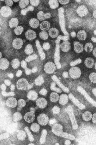 Abb. 1: Elektronenmikroskopische Aufnahme von Hepatitis-B-Viren des Menschen