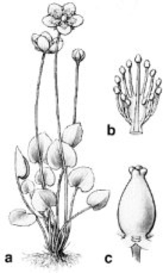 Sumpf-Herzblatt (Parnassia palustris):a Pflanze, b Staminodium, c Fruchtknoten