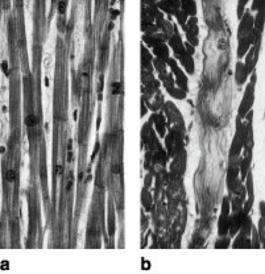 Abb. 1:a Netzwerk verzweigter Herzmuskelzellen einer Ziege (Längsschnitt), mit mittelständigen Kernen und deutlichen Zellgrenzen (Glanzstreifen), in den Netzwerklücken lockeres Bindegewebe und einzelne Blutkapillaren mit Erythrocyten; b Herzmuskulatur einer Ziege, zwischen schräggeschnittenen Muskelzellen Längsanschnitt einer plasmareichen und myofibrillenarmen Purkinje-Faser (Erregungsleitungsfaser)