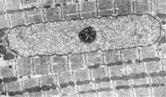 Abb. 2: Elektronenmikroskopische Aufnahme einer Herzmuskelzelle. Der Zellkern befindet sich in der Mitte; die weitgehende Überlappung der Actin- und Myosinfilamente in den Sarkomeren ist Ausdruck eines kontrahierten Zustands; Reihen von Mitochondrien trennen die Myofibrillen voneinander. –
