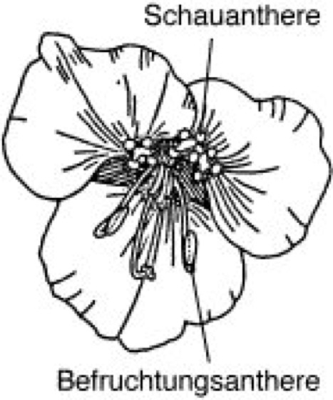 Heteranthiew [von *heter- , griech. anthos = Blüte], Verschiedenheit der Staubblätter (Staubblatt) innerhalb einer Blüte; dabei ist meist ein Teil der Staubblätter steril; sie bieten nur sterile Pollen als Blütennahrung oder sind als Staminodien (ohne Pollen) ausgebildet; solche Staubblätter übernehmen oft reine Schaufunktion (gelbe Färbung); die Staubblätter mit fertilem Pollen (Befruchtungspollen) sind meist optisch unauffällig. Ein gutes Beispiel ist die Gattung Commelina (Commelinaceae; vgl. Abb. ).
