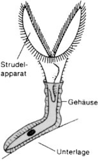 Heterotricha [von *heterotrich- ], Unterordnung der Spirotricha; allseits bewimperte Wimpertierchen mit rundem Körperquerschnitt; besitzen neben adoralen Membranellenzonen Wimperreihen (Kineten), die den Körper in Längsrichtung überziehen. Alle Arten sind Strudler. Sie gelten innerhalb der Spirotricha als die am wenigsten spezialisierten. Hierher z.B. Folliculina ampulla, das Ohrentierchen ( vgl. Abb. ), dessen Mundscheibe in 2 ohrenförmige Lappen ausgezogen ist und das in einem auf der Unterlage festgekitteten Gehäuse lebt; kommt in kalten, schattigen Gewässern vor, besonders auf Quellmoos. Hierher auch die Trompetentierchen und die Gattungen Nyctotherus, Caenomorpha undSpirostomum. Einzeller (Tab.), Postciliodesmatophora.