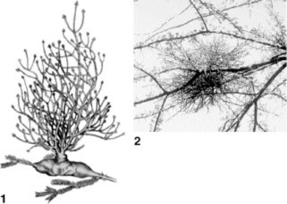 Hexenbesen 1 an einer Weiß-Tanne, 2 an einer Akazie