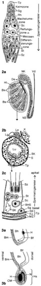 1 Hoden bei Fadenwürmern (Längsschnitt). 2 Bau des menschlichen Hodens (stark schematisiert); a Übersicht (Sagittalschnitt), b Detail: Querschnitt durch Samenkanälchen, c Ausschnitt aus b: Sertoli-Zelle mit Spermatogenese-Stadien. 3Hodenabstieg (Descensus testiculorum) bei Säugetieren; a ursprünglicher Zustand (zugleich auch der embryonale Zustand); b räumliche Beziehungen nach erfolgtem Hodenabstieg.
