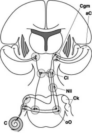 Darstellung der aufsteigenden Hörbahn im Gehirn des Menschen: aC auditorischer Cortex, C Cochlea, Cgm Corpus geniculatum mediale, Ci Colliculus inferior, Ck Cochleariskerne, Nll Nucleus lemniscus lateralis, oO obere Olive