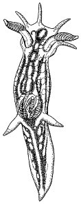 Hörnchenschnecken, Polyceridae, Familieder Hinterkiemer (Ordnung Doridacea), marine Nacktkiemer mit langem, schmalem, hohem Körper, dessen Rücken hörnchenartige Fortsätze trägt. Von den 8 Gattungen ist Polycera die weitestverbreitete. Die Gestreiften Hörnchenschnecken (Polycera quadrilineata; ö vgl. Abb. ) werden ca. 3 cm lang; am Kopf inserieren 4 spitze Anhänge; die Tiere sind grau mit orangen Flecken, doch sehr variabel; sie leben an Seegras und Tangen und ernähren sich von Moostierchen; nachgewiesen sind sie in Ostatlantik, Mittelmeer und Nordsee.