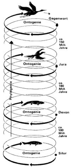 Die Hologeniespirale nach W. Zimmermann zeigt, daß die stammesgeschichtliche Entwicklung in der Generationenfolge über viele Ontogenien verläuft. Durch Erbänderungen, die sich in den jeweiligen Ontogenien realisieren, kommt es in den Jahrmillionen der Erdgeschichte zu entsprechenden Änderungen der Organisationstypen der Organismen, d.h. also zur Phylogenie.