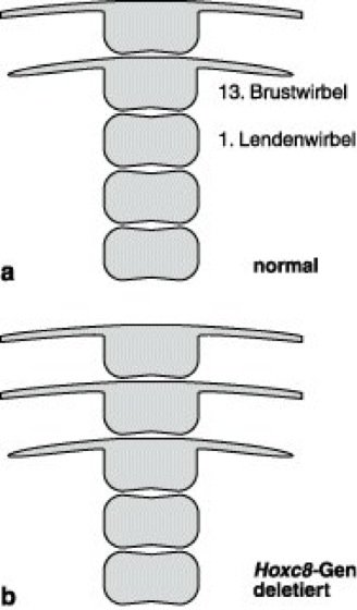 Hömöotische Transformation bei der Maus: die Umwandlung des 1. Lendenwirbels (a) in einen 14. Brustwirbel mit Rippen (anteriore Transformation, b) ist durch eine Deletion des Hoxc8-Gens bedingt.