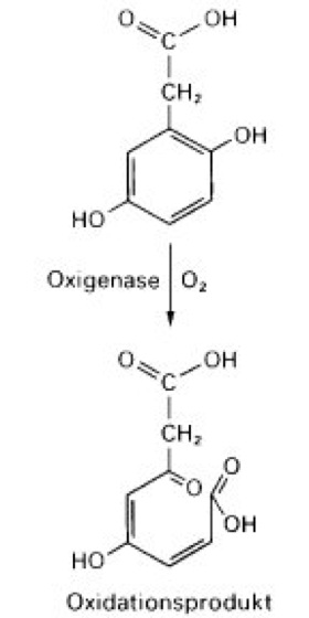 Homogentisinsäure, ein Abbauprodukt von Phenylalanin und Tyrosin ( ä vgl. Abb. ), das durch weiteren Abbau zu Acetessigsäure und Fumarsäure umgewandelt wird und damit in den Citratzyklus eingeschleust wird. Der genetisch bedingte Defekt von Homogentisinsäure-Oxigenase (Homogentisinsäure-Oxidase), dem Enzym, das den Abbau von Homogentisinsäure einleitet, bewirkt, daß es im Urin ausgeschieden wird (Alkaptonurie).