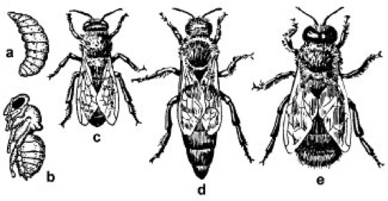 Abb. 1: Eigentliche Honigbiene (Apis mellifera): a Larve (Made), b Puppe, c Arbeiterin, d Königin, e Drohne
