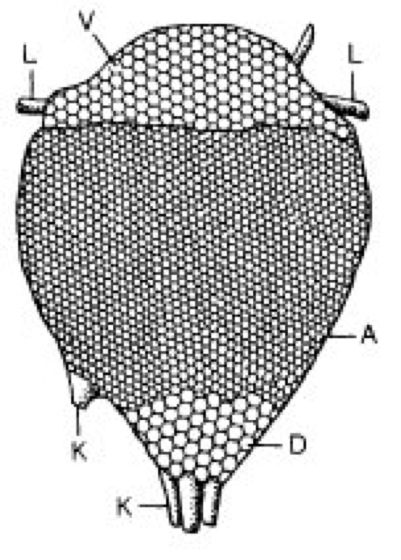 Abb. 2: Nest der Zwerghonigbiene (Apis florea), besteht aus nur einer einzigen Wabe. A Arbeiterinnenzellen, D Drohnenzellen, K Königinnenzellen, L Leimring, V Vorratszellen