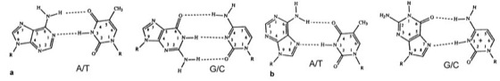 Strukturformeln zu a Watson-Crick- und b Hoogsteen-Basenpaaren. Adenin/Thymin (= A/T) und Guanin/Cytosin (= G/C)