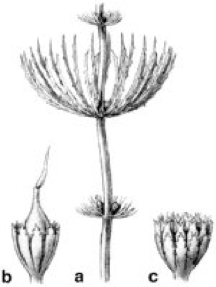 Rauhes Hornblatt (Ceratophyllum demersum):a Pflanze, b karpellate Blüte, c staminate Blüte. Die winzigen, eingeschlechtigen Blüten bestehen aus zahlreichen Staubblättern bzw. einem Fruchtblatt, sitzen einzeln in den Blattachseln und sind von einer Hülle aus 8–12 linealen Blättchen umgeben. Die Frucht ist eine einsamige Nuß.