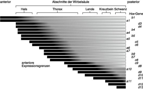 Gestaffelte Expression von Hox-Genen entlang der Körperlängsachse im Mesoderm der Maus. Jeder Abschnitt der Wirbelsäule ist charakterisiert durch die Expression eines bestimmten Satzes von Hox-Genen, den Hox-Code, der z.B. die jeweils unterschiedliche Identität der einzelnen Wirbel festlegt.