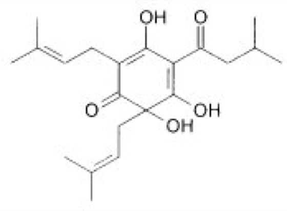 Humulons, α-Hopfenbittersäure, ein im Harz des reifen Hopfens(Humulus lupulus) enthaltener, bakteriostatisch wirkender Bitterstoff ( vgl. Abb. ).